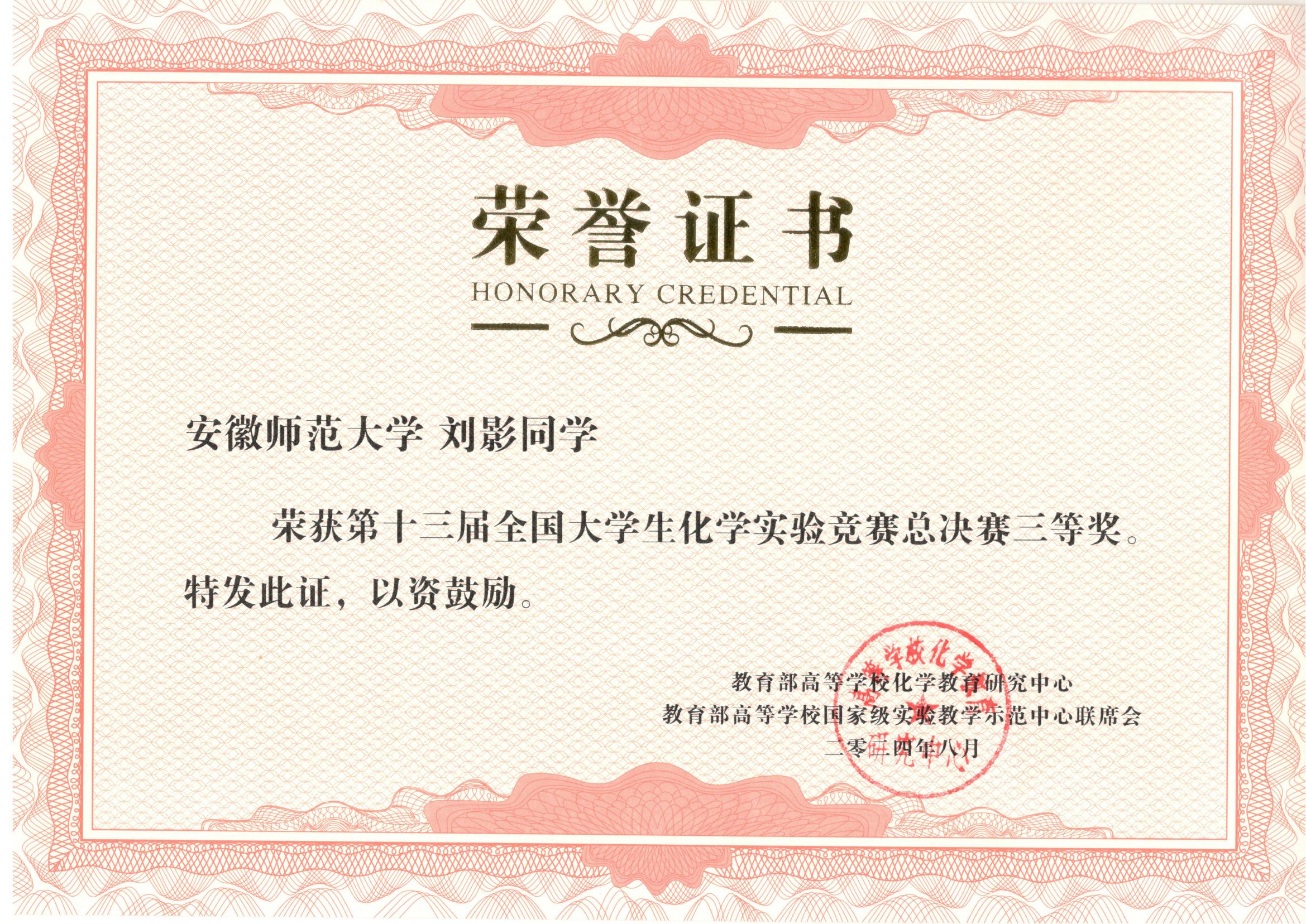 5 | 第十三届全国大学生化学实验竞赛总决赛 | 教育部高等学校化学教育研究中心、教育部高等学校国家级实验教学示范中心联席会 | 刘影 | 三等奖 | 张武、王正华 |