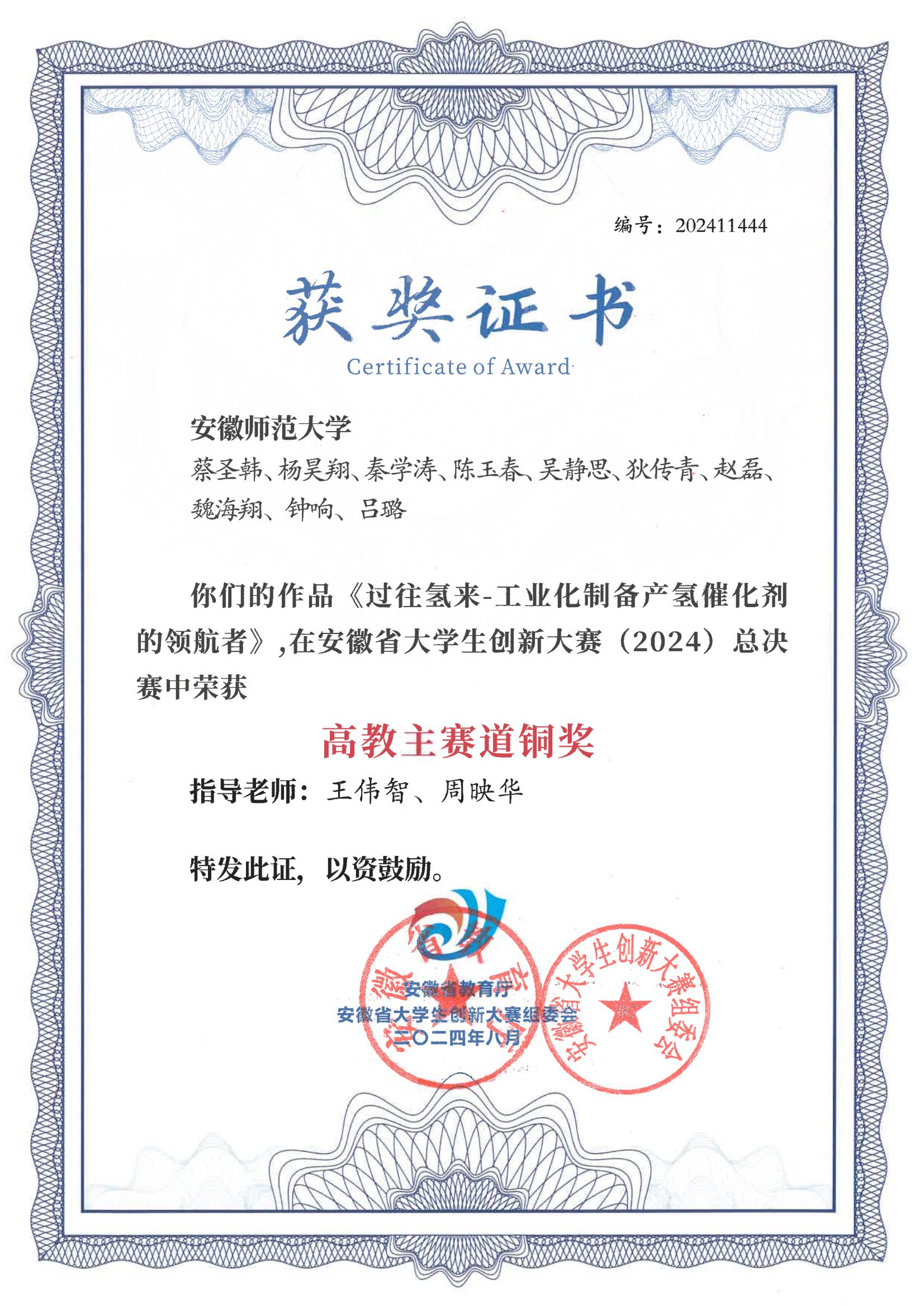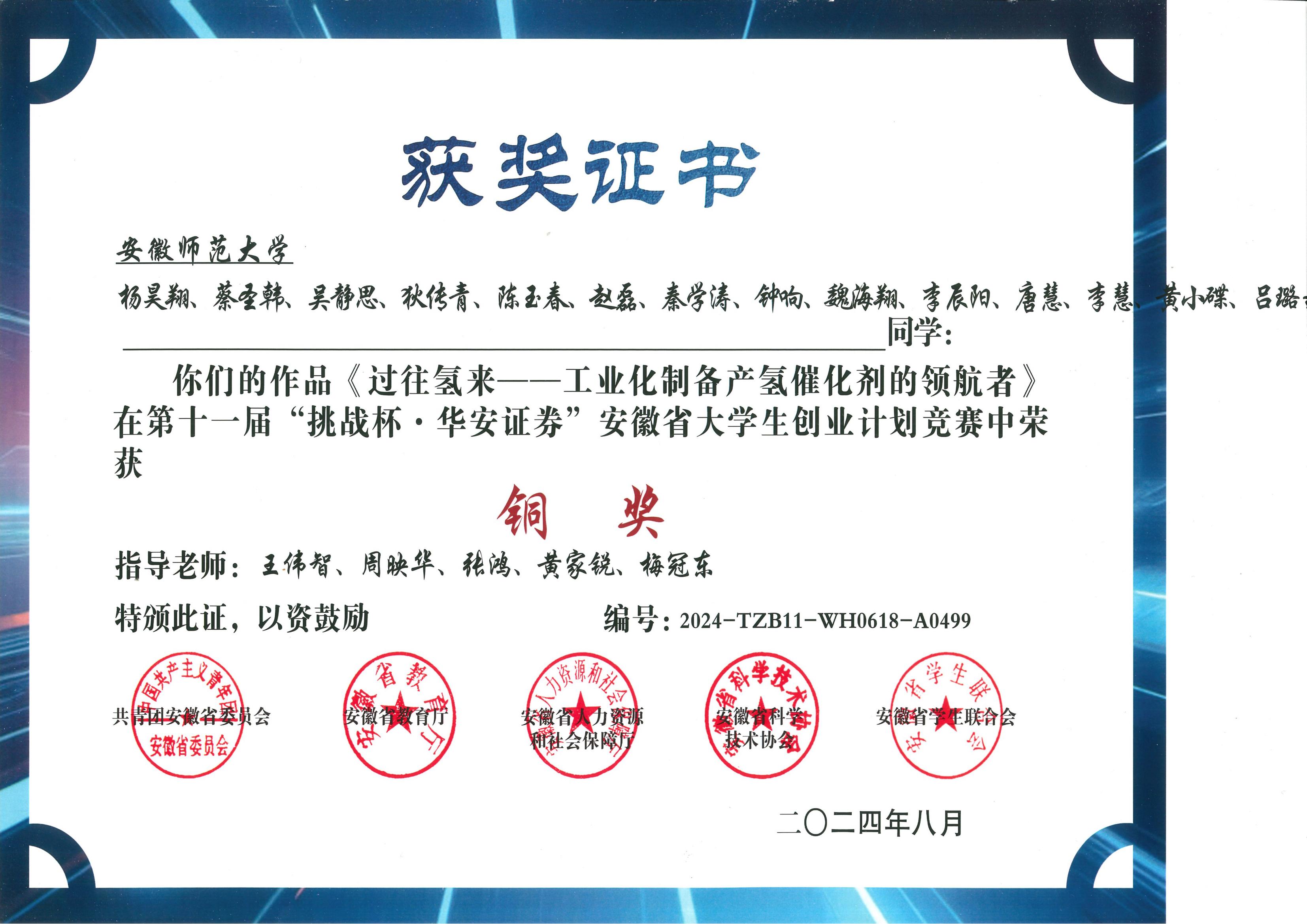 24 | 安徽省大学生创新大赛(2024)总决赛 | 安徽省教育厅、安徽省大学生创新大赛组委会 | 蔡圣韩、杨昊翔、秦学涛、陈玉春、吴静思、狄传青、赵磊、魏海翔、钟响、吕璐 | 高教主赛道铜奖 | 王伟智、周映华 |