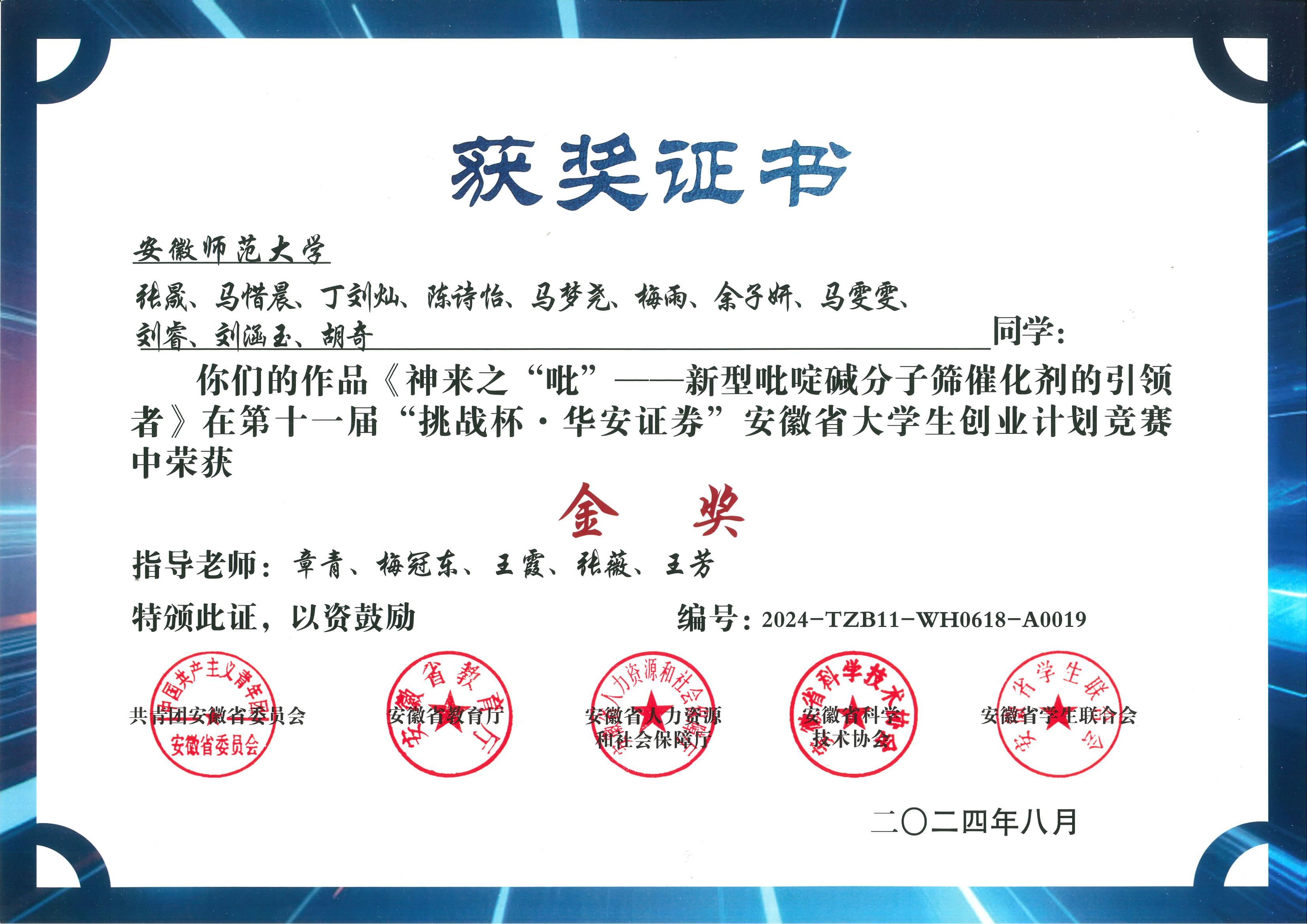 16 | 第十一届“挑战杯·华安证券”安徽省大学生创业计划竞赛 | 共青团安徽省委员会、安徽省教育厅、安徽省人力资源和社会保障厅、安徽省科学技术协会、安徽省学生联合会 | 张晟、马惜晨、丁刘灿、陈诗怡、马梦尧、梅雨、余子妍、马雯雯、刘睿、刘涵玉、胡奇 | 金奖 | 章青、梅冠东、王霞、张薇、王芳 |