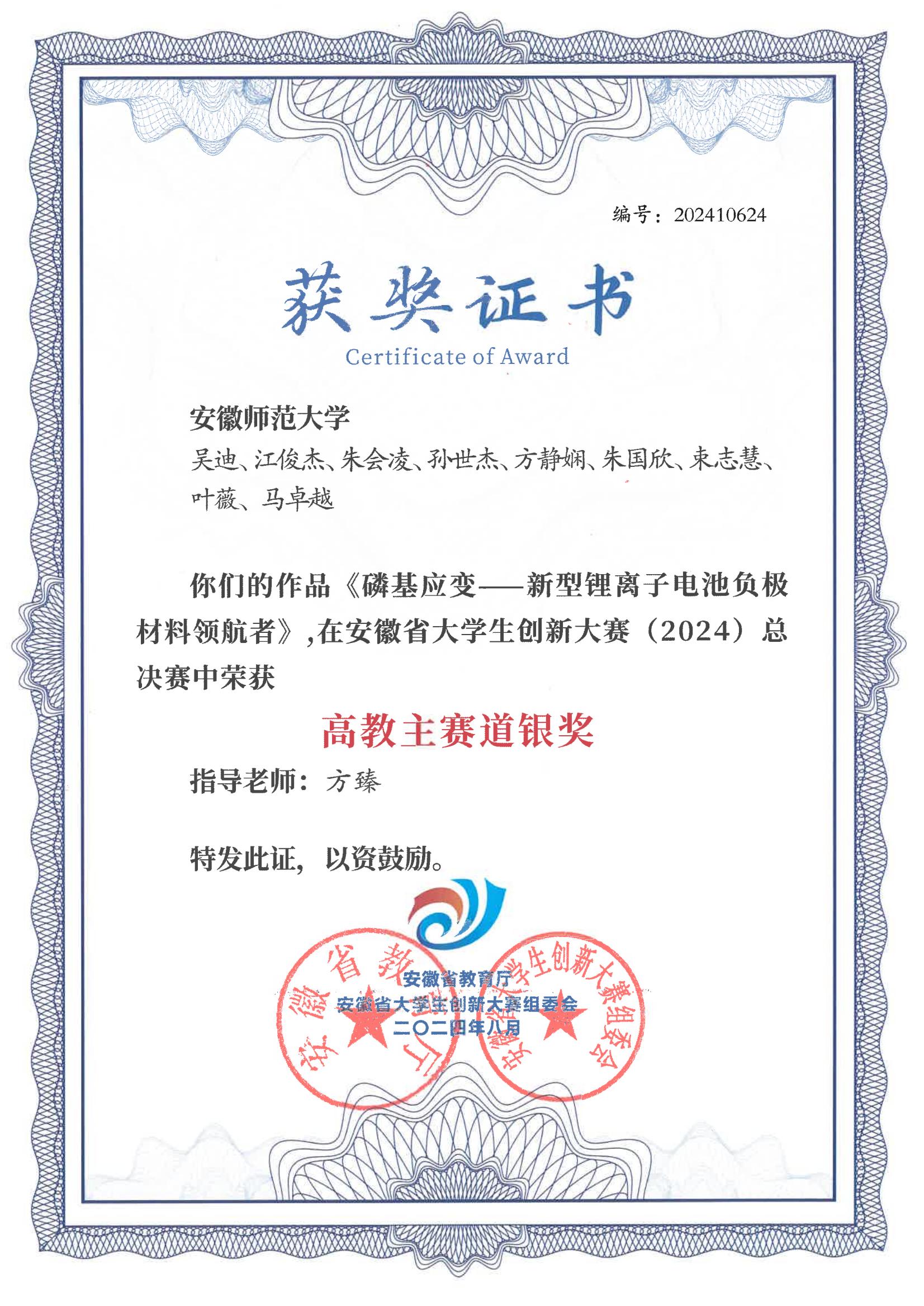 22 | 安徽省大学生创新大赛(2024)总决赛 | 安徽省教育厅、安徽省大学生创新大赛组委会 | 吴迪、江俊杰、朱会凌、孙世杰、方静娴、朱国欣、束志慧、叶薇、马卓越 | 高教主赛道银奖 | 方臻 |