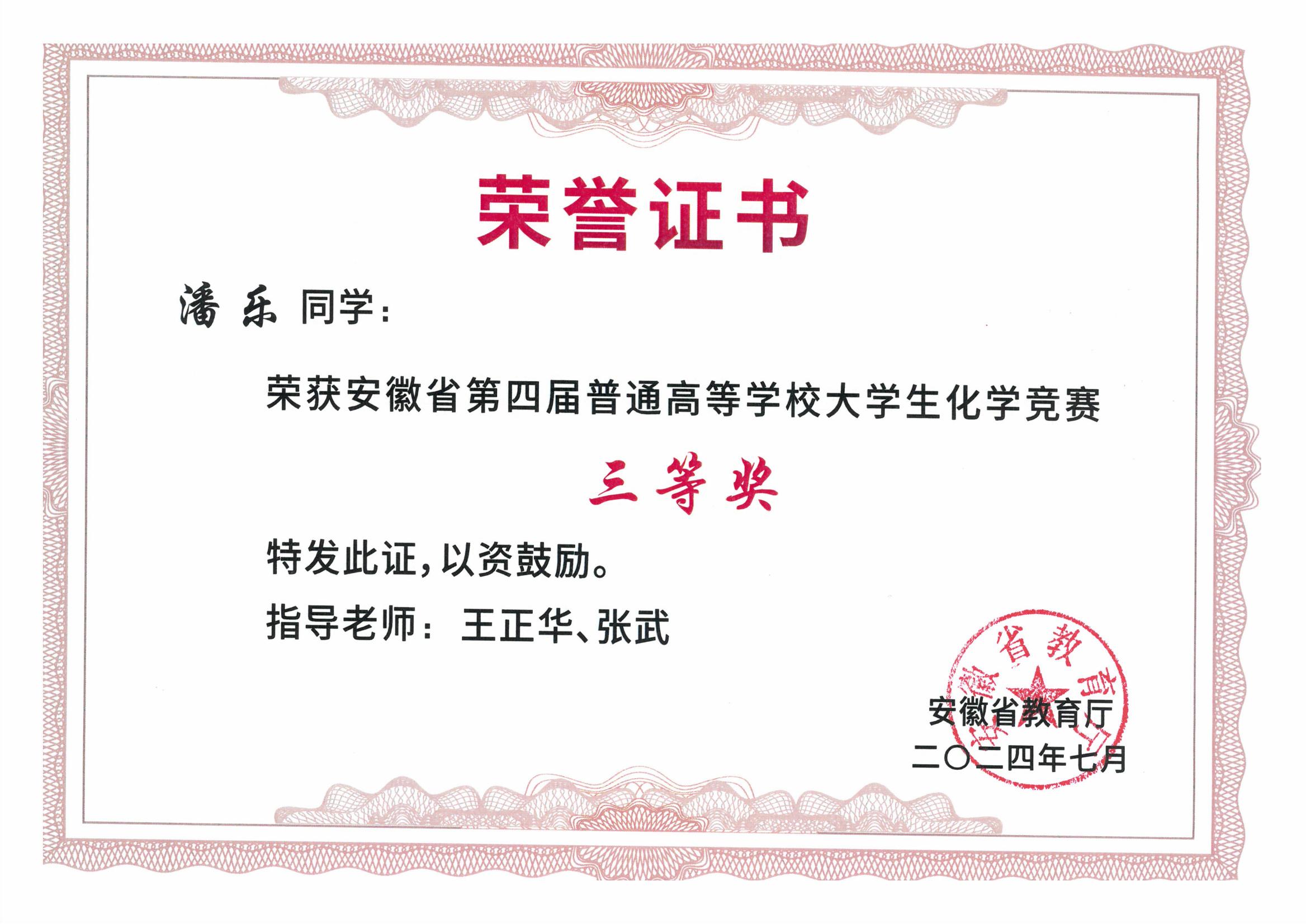 32 | 安徽省第四届普通高等学校大学生化学竞赛 | 安徽省教育厅 | 潘乐 | 三等奖 | 王正华、张武 |