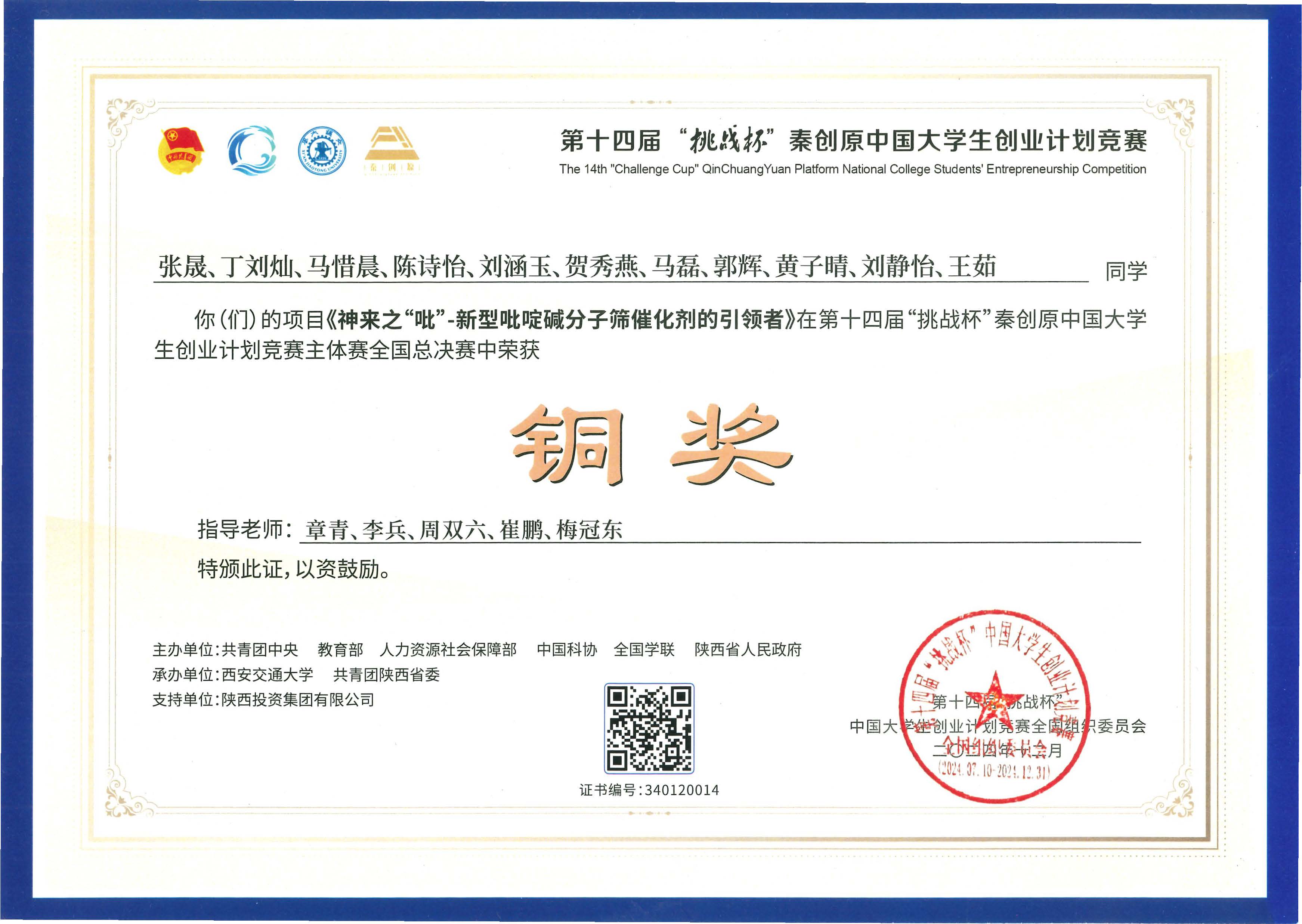2 | 第十四届“挑战杯”秦创原中国大学生创业计划竞赛主题赛 | 教育部等部委 | 张晟、丁刘灿、马惜晨、陈诗怡、刘涵玉 | 铜奖 | 章青、梅冠东、李兵、周双六、崔鹏 |