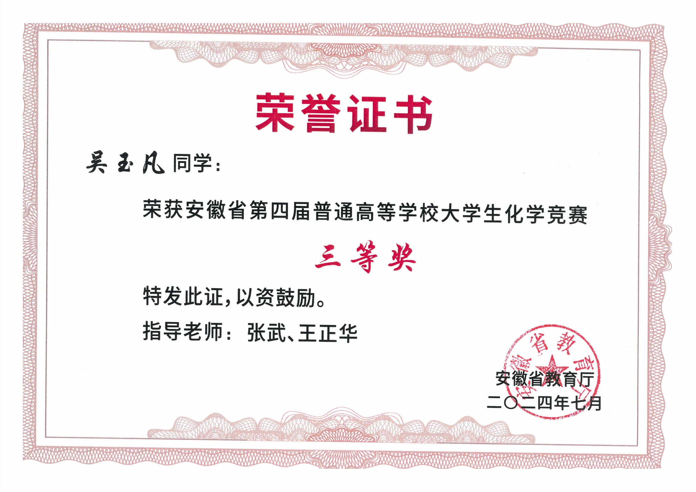 33 | 安徽省第四届普通高等学校大学生化学竞赛 | 安徽省教育厅 | 吴玉凡 | 三等奖 | 张武、王正华 |