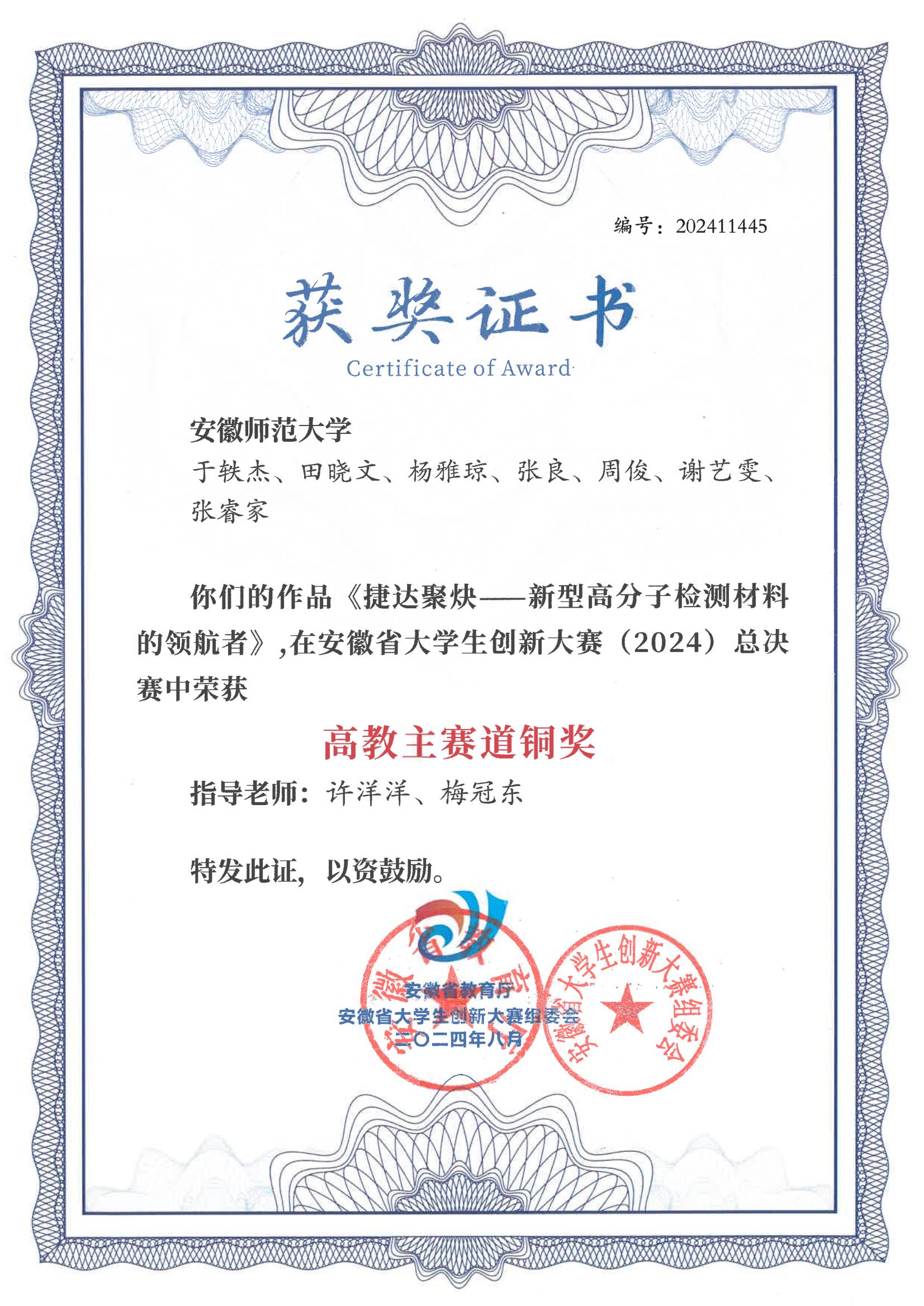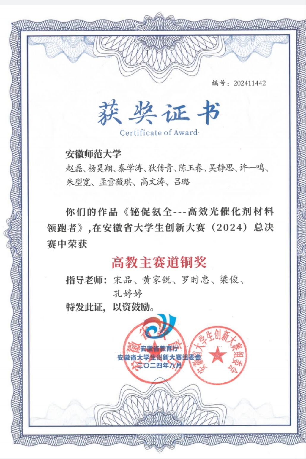 26 | 安徽省大学生创新大赛(2024)总决赛 | 安徽省教育厅、安徽省大学生创新大赛组委会 | 于轶杰、田晓文、杨雅琼、张良、周俊、谢艺雯、张睿家 | 高教主赛道铜奖 | 许洋洋、梅冠东 |