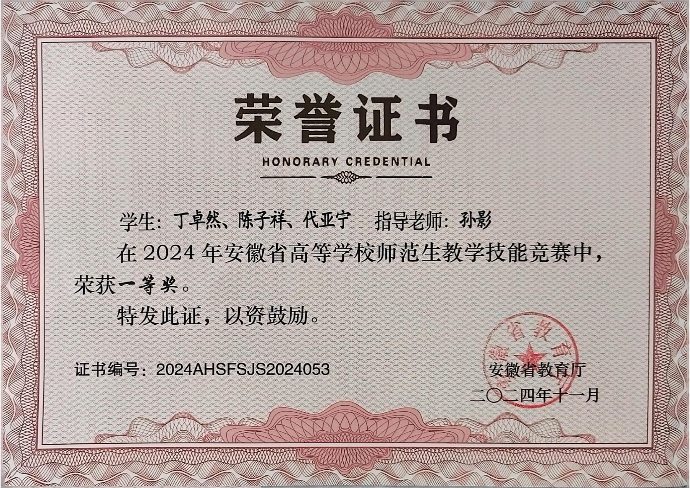 38 | 2024年安徽省高等学校师范生教学技能竞赛 | 安徽省教育厅 | 丁卓然、陈子祥、代亚宁 | 一等奖 | 孙影 |