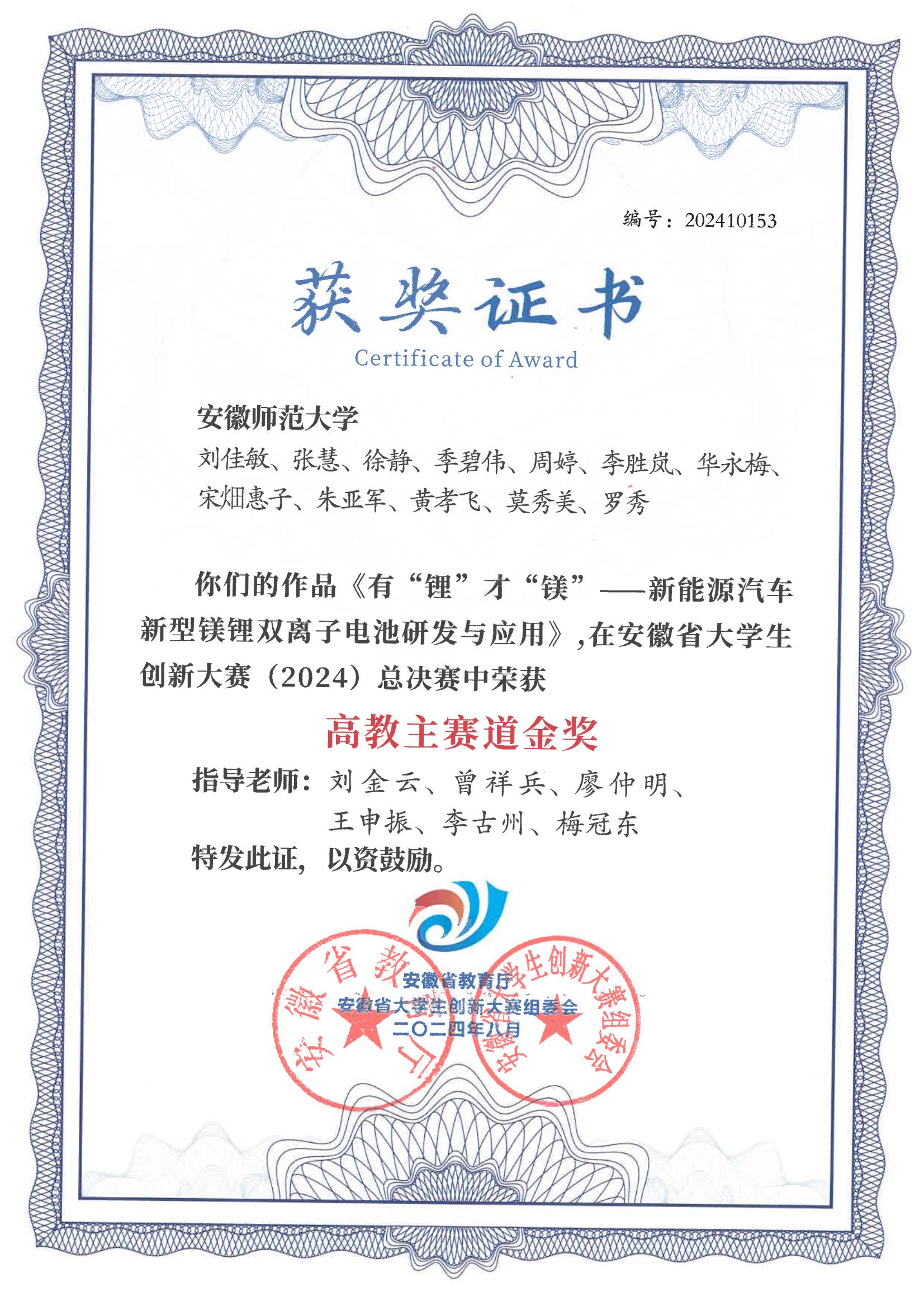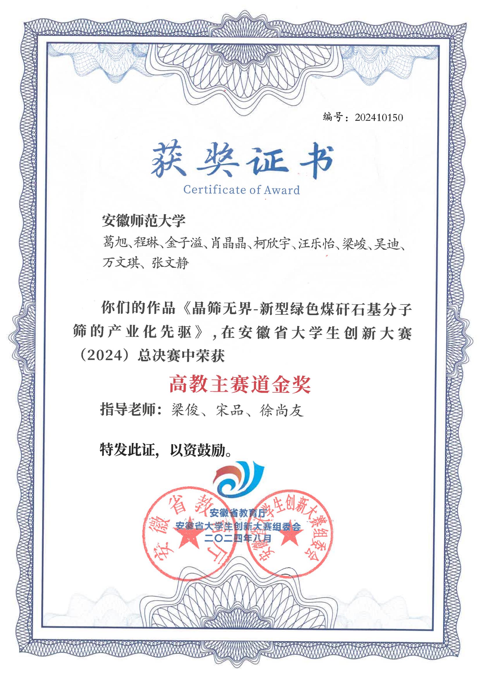 21 | 安徽省大学生创新大赛(2024)总决赛 | 安徽省教育厅、安徽省大学生创新大赛组委会 | 葛旭、程琳、金子溢、肖晶晶、柯欣宇、汪乐怡、梁峻、吴迪、万文琪、张文静 | 高教主赛道金奖 | 梁俊、宋品、徐尚友 |