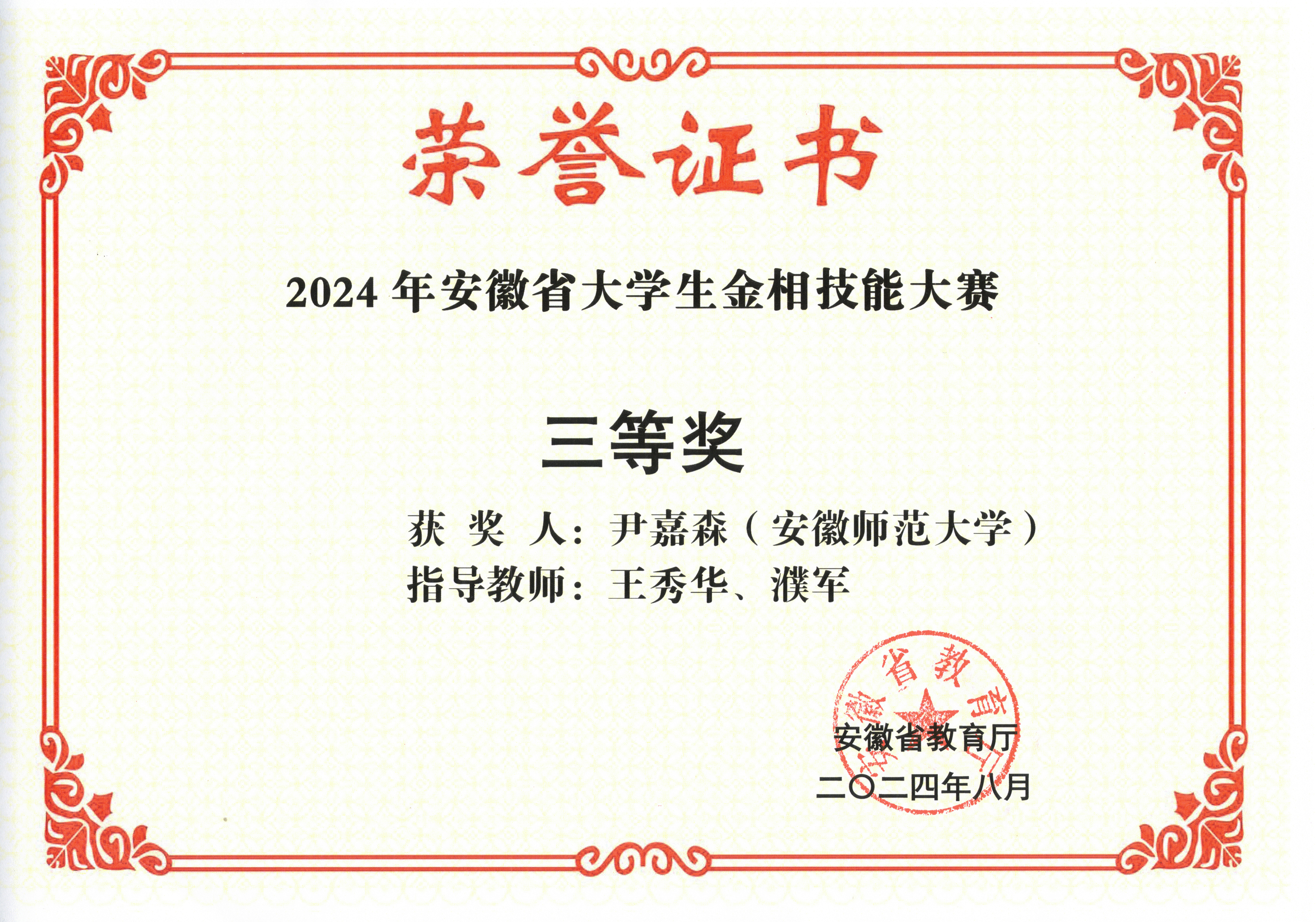 35 | 2024安徽省大学生金相技能大赛 | 安徽省教育厅 | 尹嘉森 | 三等奖 | 王秀华、濮军 |