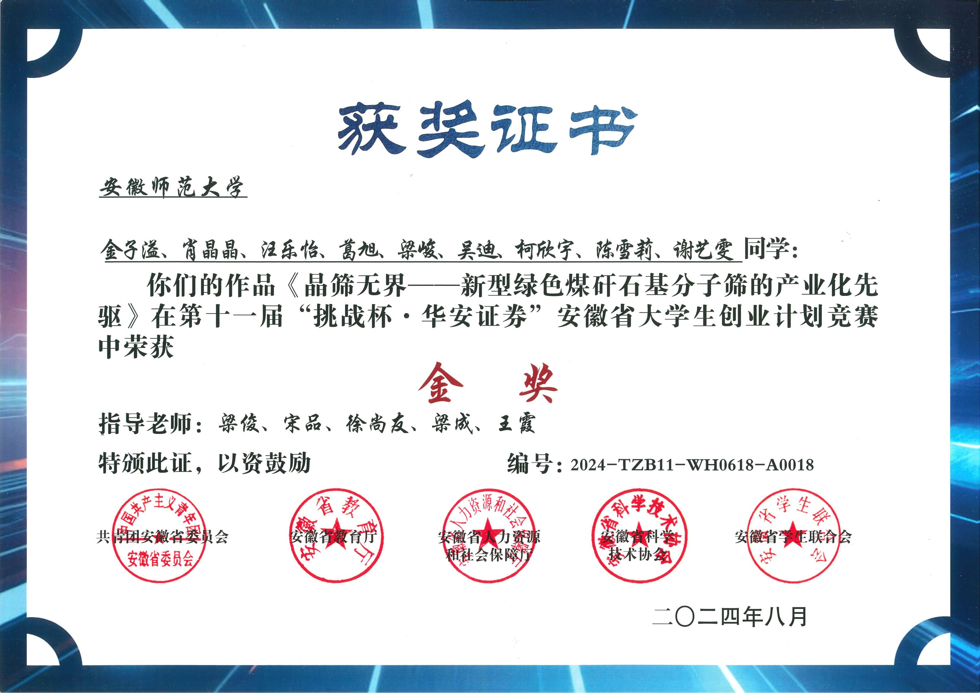 15 | 第十一届“挑战杯·华安证券”安徽省大学生创业计划竞赛 | 共青团安徽省委员会、安徽省教育厅、安徽省人力资源和社会保障厅、安徽省科学技术协会、安徽省学生联合会 | 金子溢、肖晶晶、汪乐怡、葛旭、梁峻、吴迪、柯欣宇、陈雪莉、谢艺雯 | 金奖 | 梁俊、宋品、徐尚友、梁成、王霞 |
