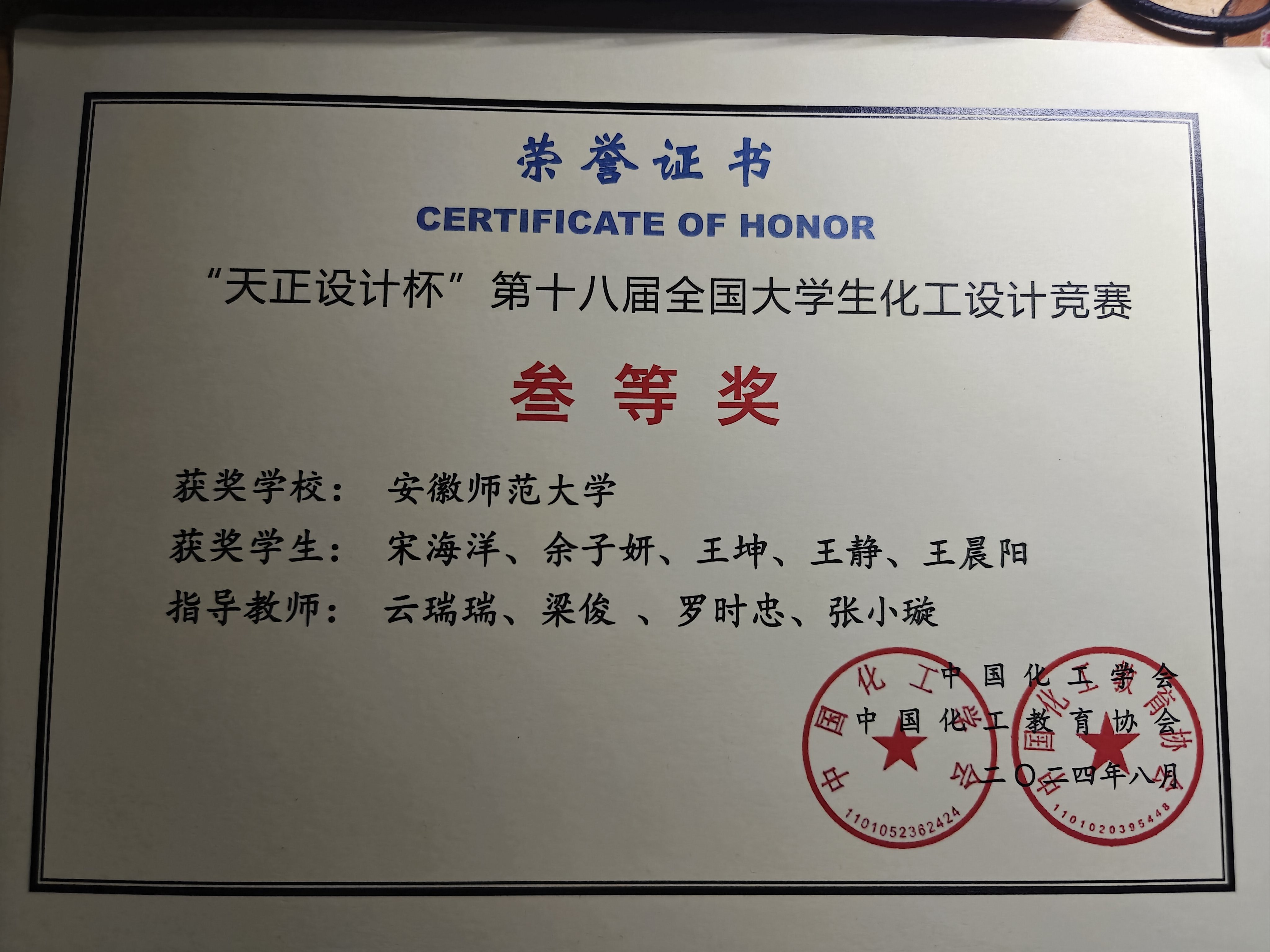 13 | “天正设计杯”第十八届全国大学生化工设计竞赛 | 中国化工学会、中国化工教育协会 | 宋海洋、余子妍、王坤、王静、王晨阳 | 三等奖 | 云瑞瑞、梁俊、罗时忠、张小璇 |
