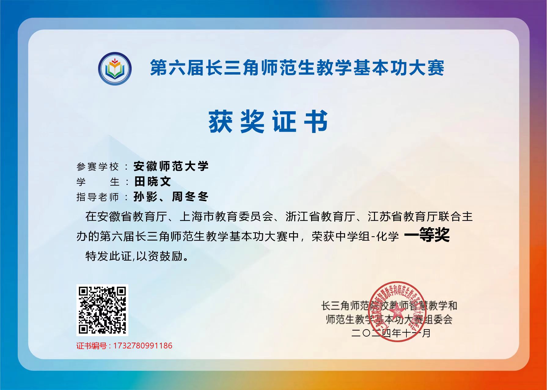 11 | 第六届长三角师范生教学基本功大赛 | 长三角师范院校教师智慧教学和师范生教学基本功大赛组委会 | 田晓文 | 一等奖 | 孙影、周冬冬 |
