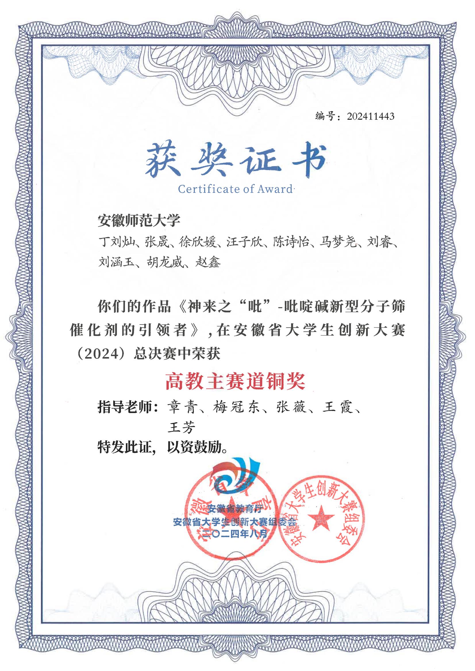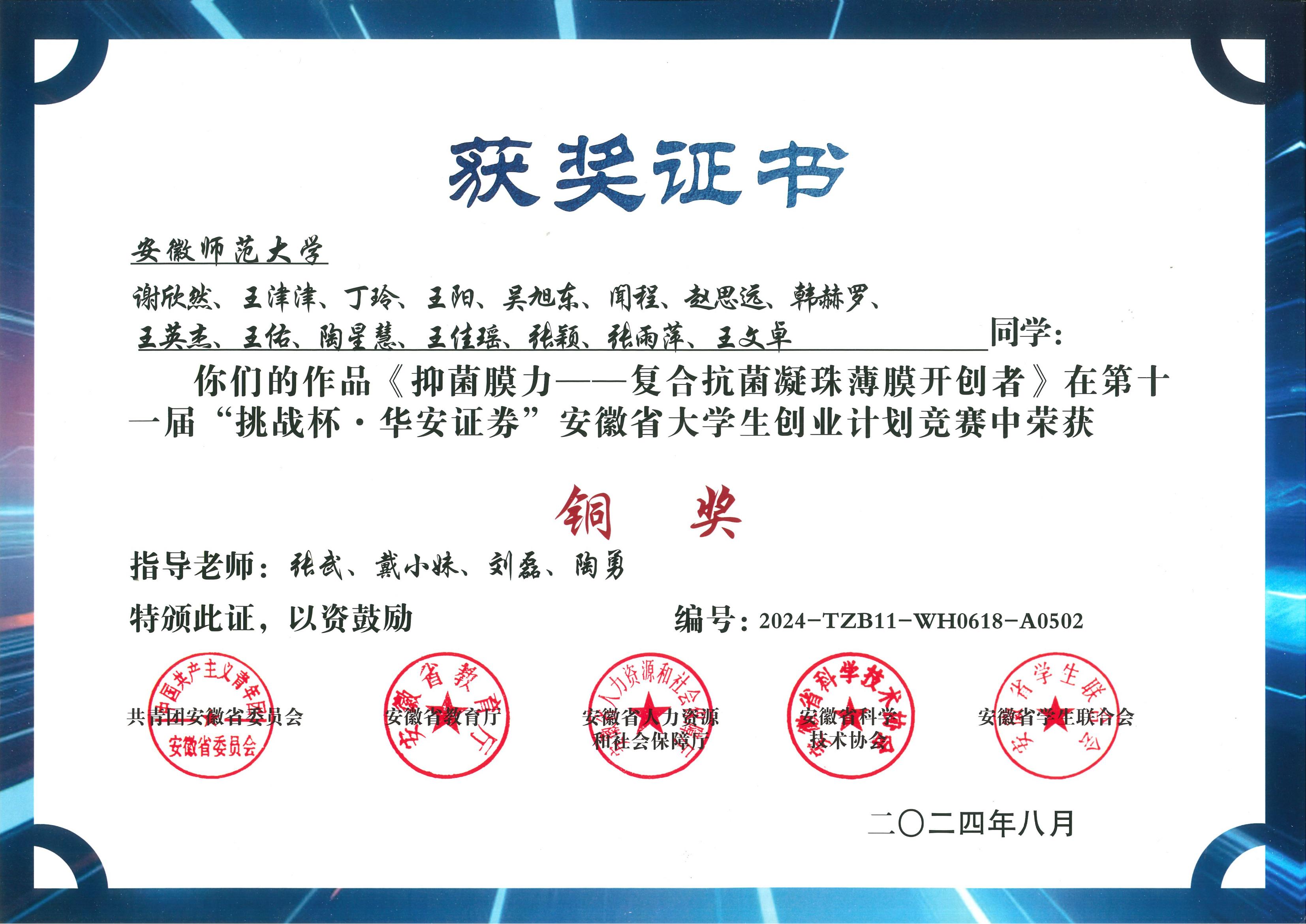 25 | 安徽省大学生创新大赛(2024)总决赛 | 安徽省教育厅、安徽省大学生创新大赛组委会 | 王津津、丁玲、谢欣然、王其豪、王佳瑶、王阳、陶星慧、张颖、赵思远、郑锁兰、金子凤 | 高教主赛道铜奖 | 张武、戴小妹、刘磊、陶勇 |