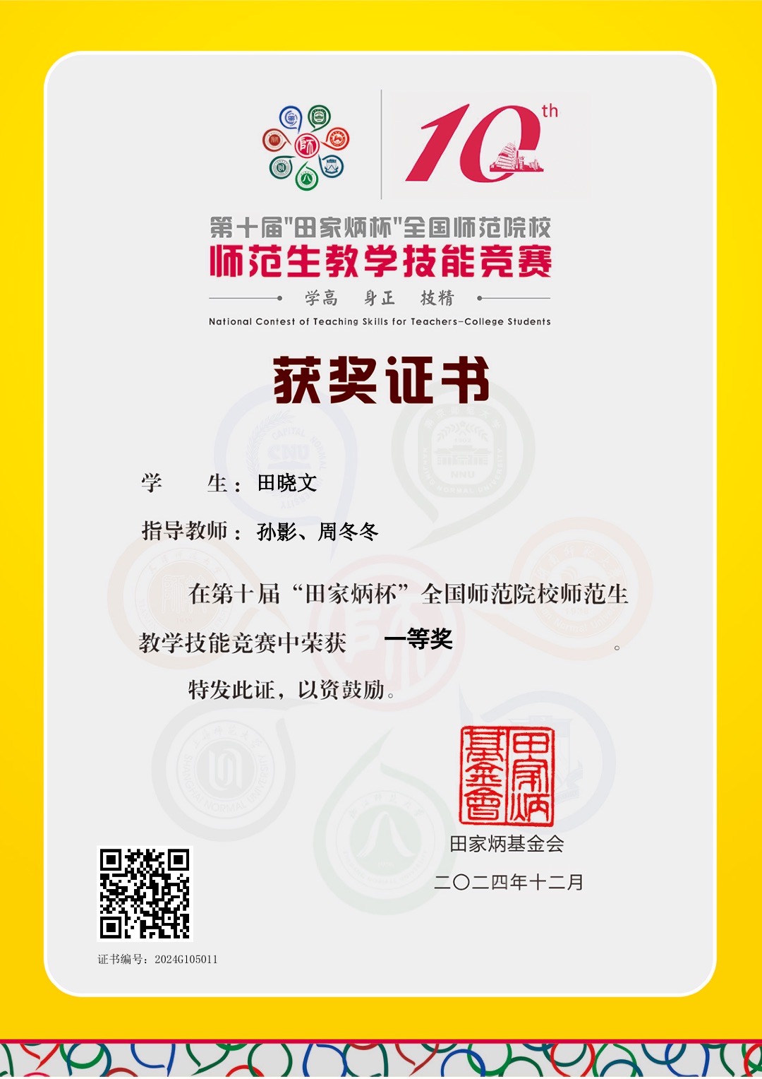 9 | 第十届“田家炳杯”全国师范院校师范生教学技能竞赛 | 田家炳基金会 | 田晓文 | 一等奖 | 孙影、周冬冬 |