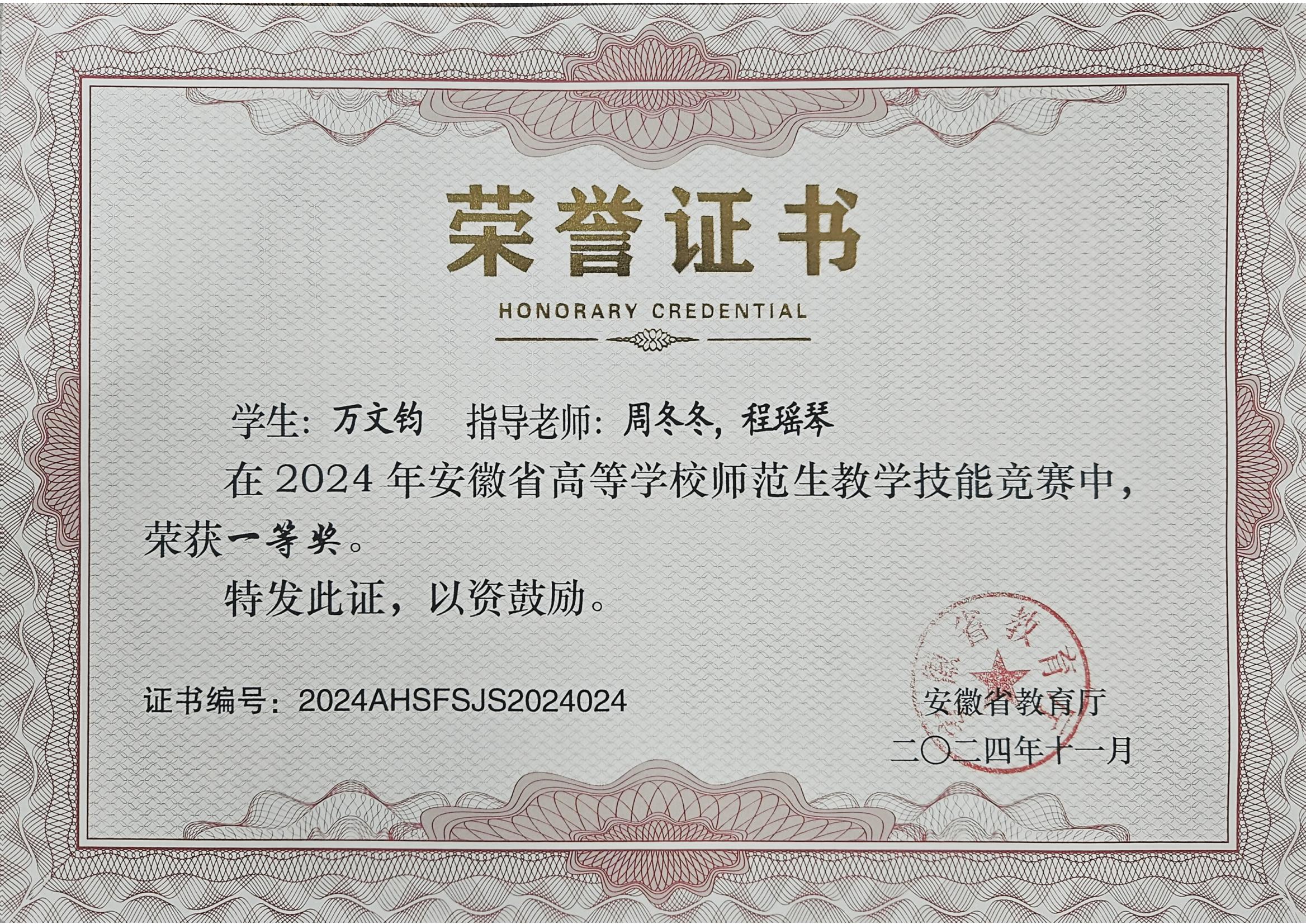 39 | 2024年安徽省高等学校师范生教学技能竞赛 | 安徽省教育厅 | 万文钧 | 一等奖 | 周冬冬、程瑶琴 |