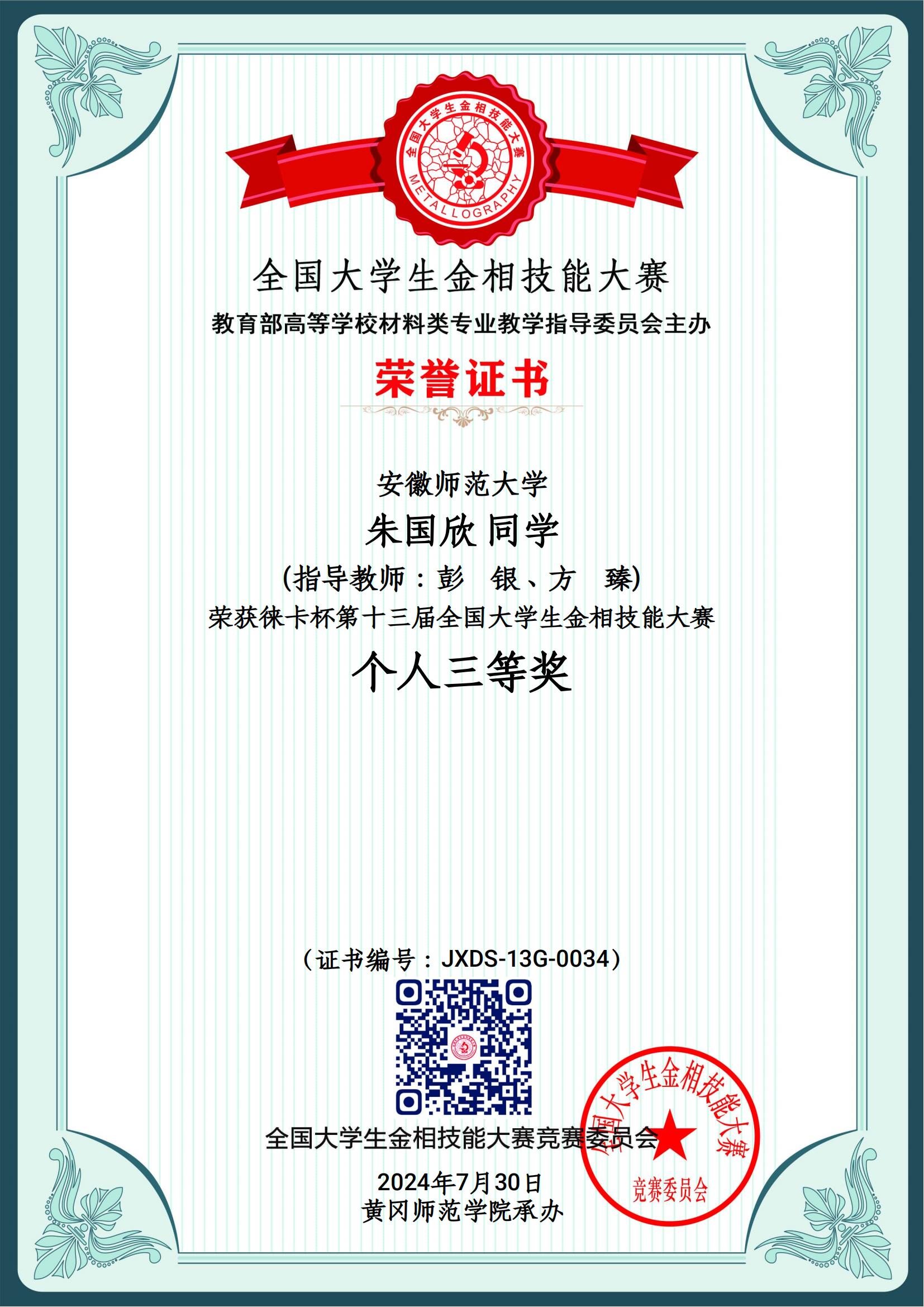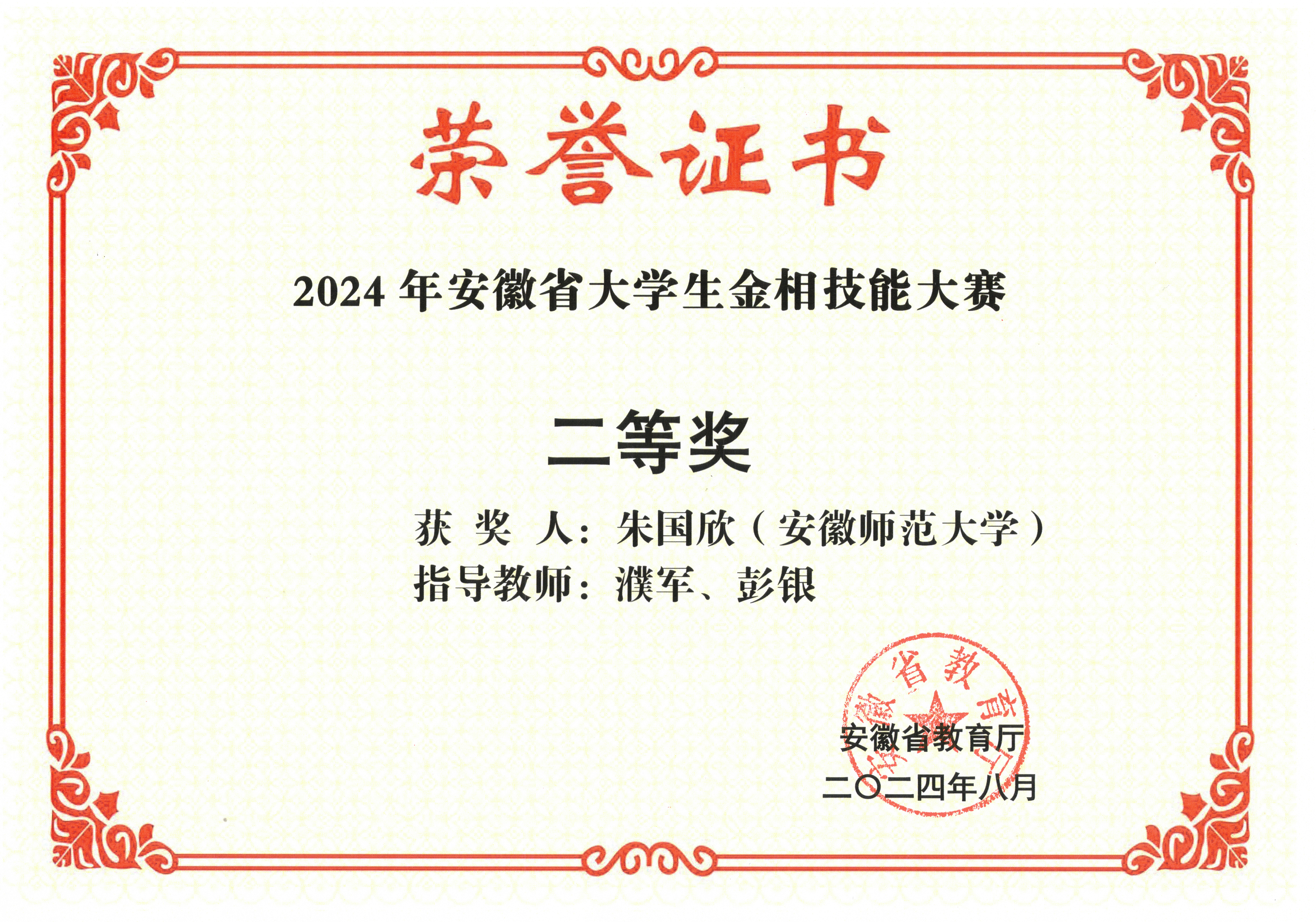 34 | 2024安徽省大学生金相技能大赛 | 安徽省教育厅 | 朱国欣 | 二等奖 | 濮军、彭银 |