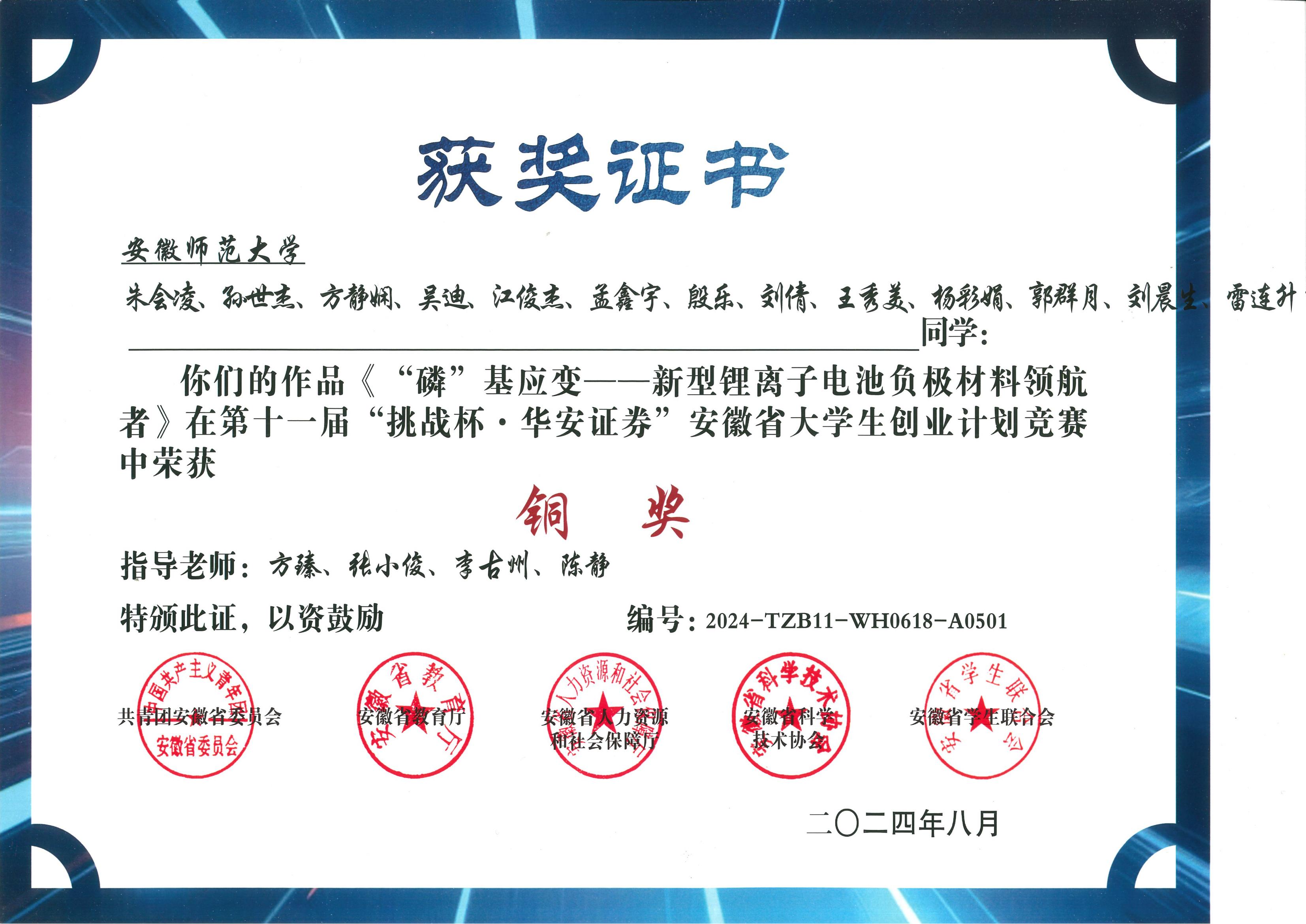 18 | 第十一届“挑战杯·华安证券”安徽省大学生创业计划竞赛 | 共青团安徽省委员会、安徽省教育厅、安徽省人力资源和社会保障厅、安徽省科学技术协会、安徽省学生联合会 | 朱会凌、孙世杰、方静娴、吴迪、江俊杰、孟鑫宇、殷乐、刘倩、王秀美、杨彩娟、郭群月、刘晨生、雷连升 | 铜奖 | 方臻、张小俊、李古州、陈静 |