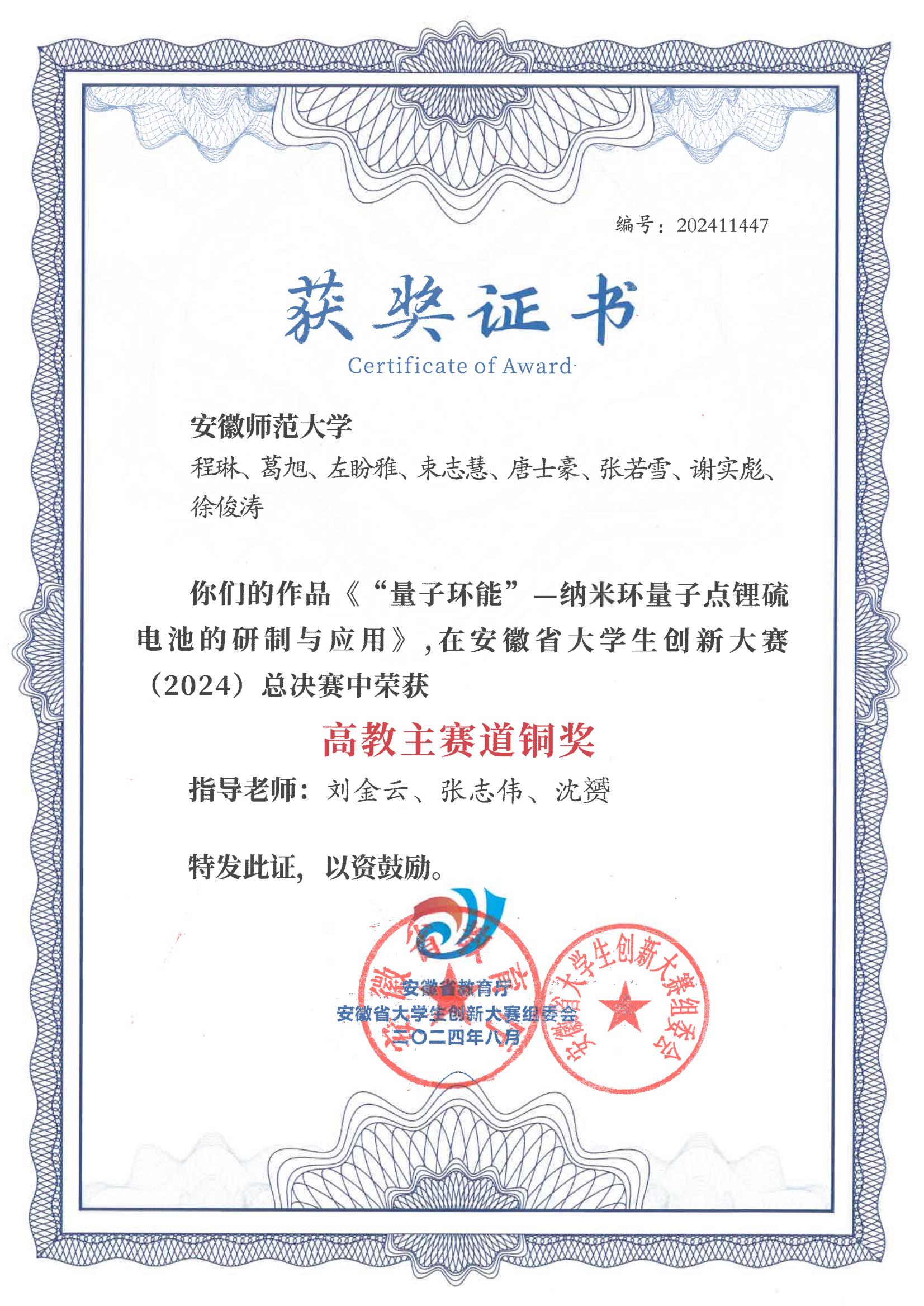 23 | 安徽省大学生创新大赛(2024)总决赛 | 安徽省教育厅、安徽省大学生创新大赛组委会 | 程琳、葛旭、左盼雅、束志慧、唐士豪、张若雪、谢实彪、徐俊涛 | 高教主赛道铜奖 | 刘金云、张志伟、沈赟 |