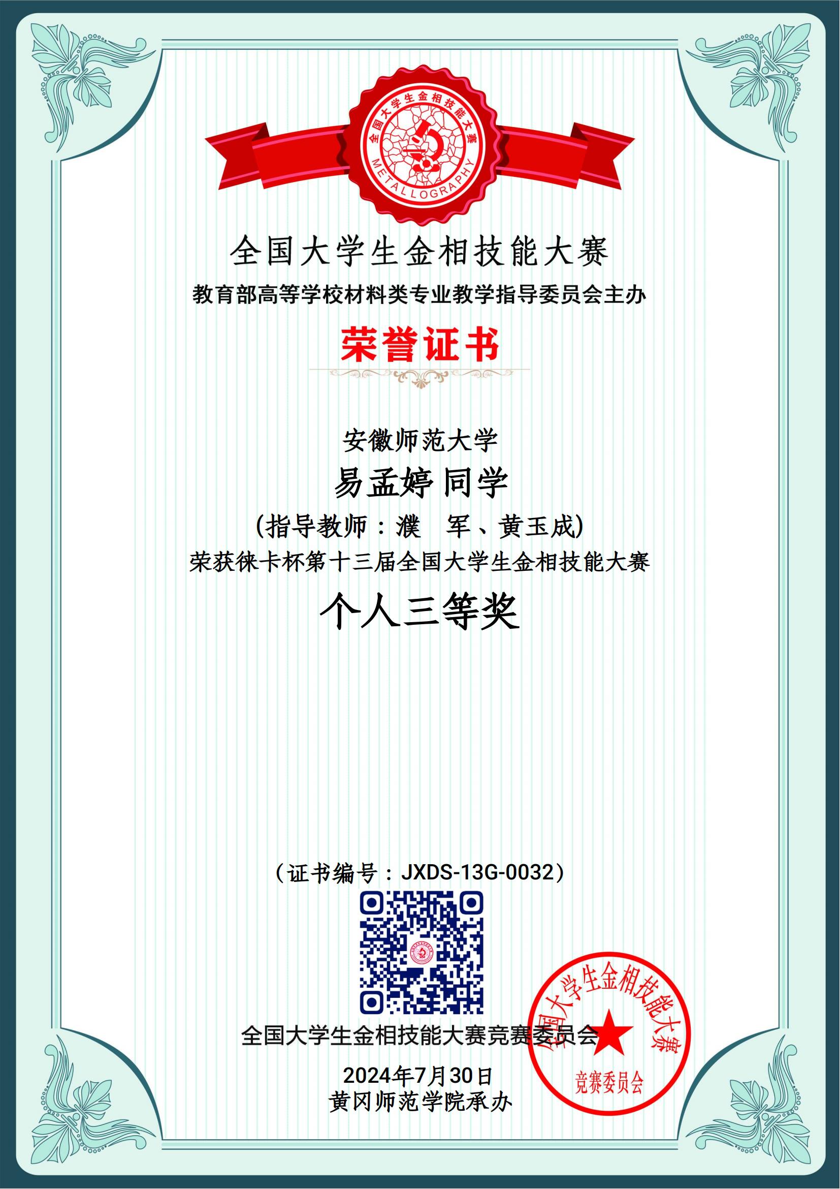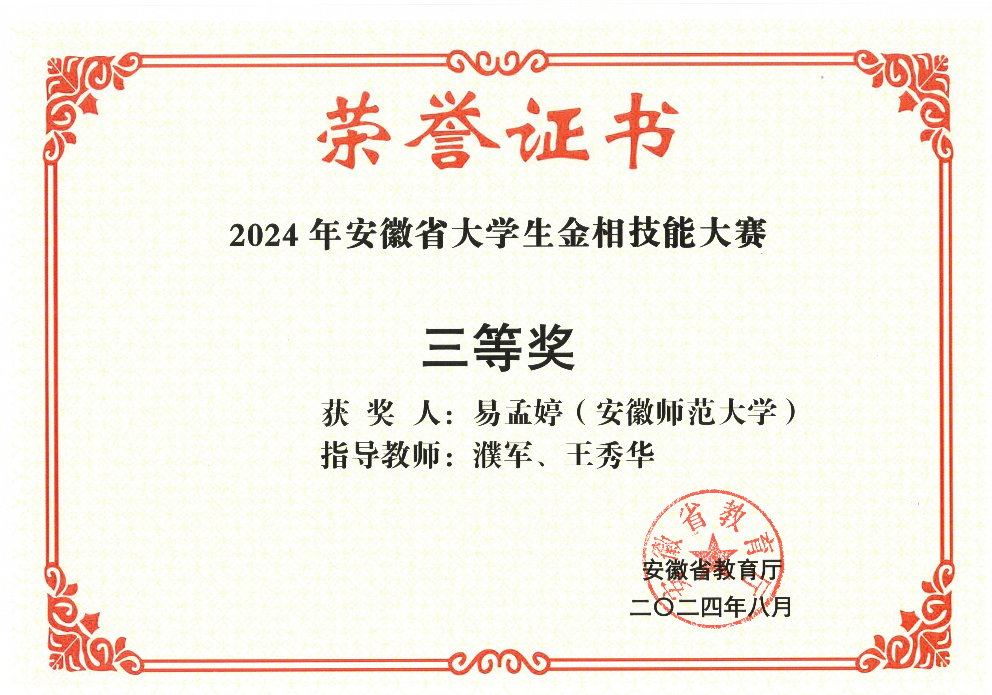 37 | 2024安徽省大学生金相技能大赛 | 安徽省教育厅 | 易孟婷 | 三等奖 | 濮军、王秀华 |