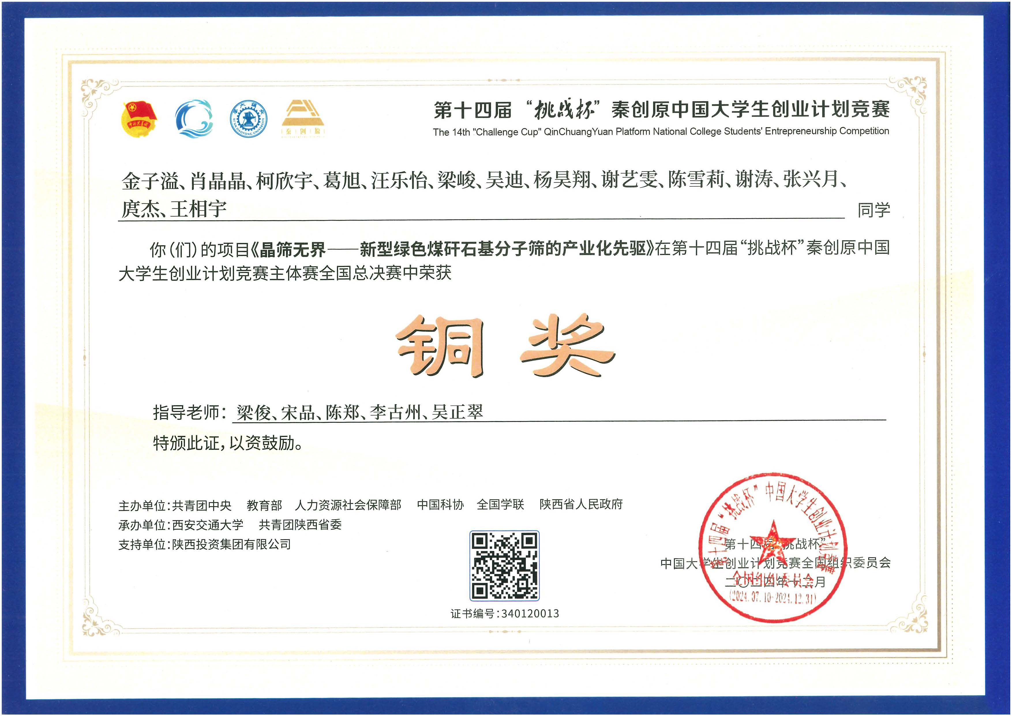 1 | 第十四届“挑战杯”秦创原中国大学生创业计划竞赛主题赛 | 教育部等部委 | 金子溢、肖晶晶、柯欣宇、葛旭、汪乐怡、梁峻、吴迪、杨昊翔、谢艺雯 | 铜奖 | 梁俊、宋品、陈郑、李古州、吴正翠 |